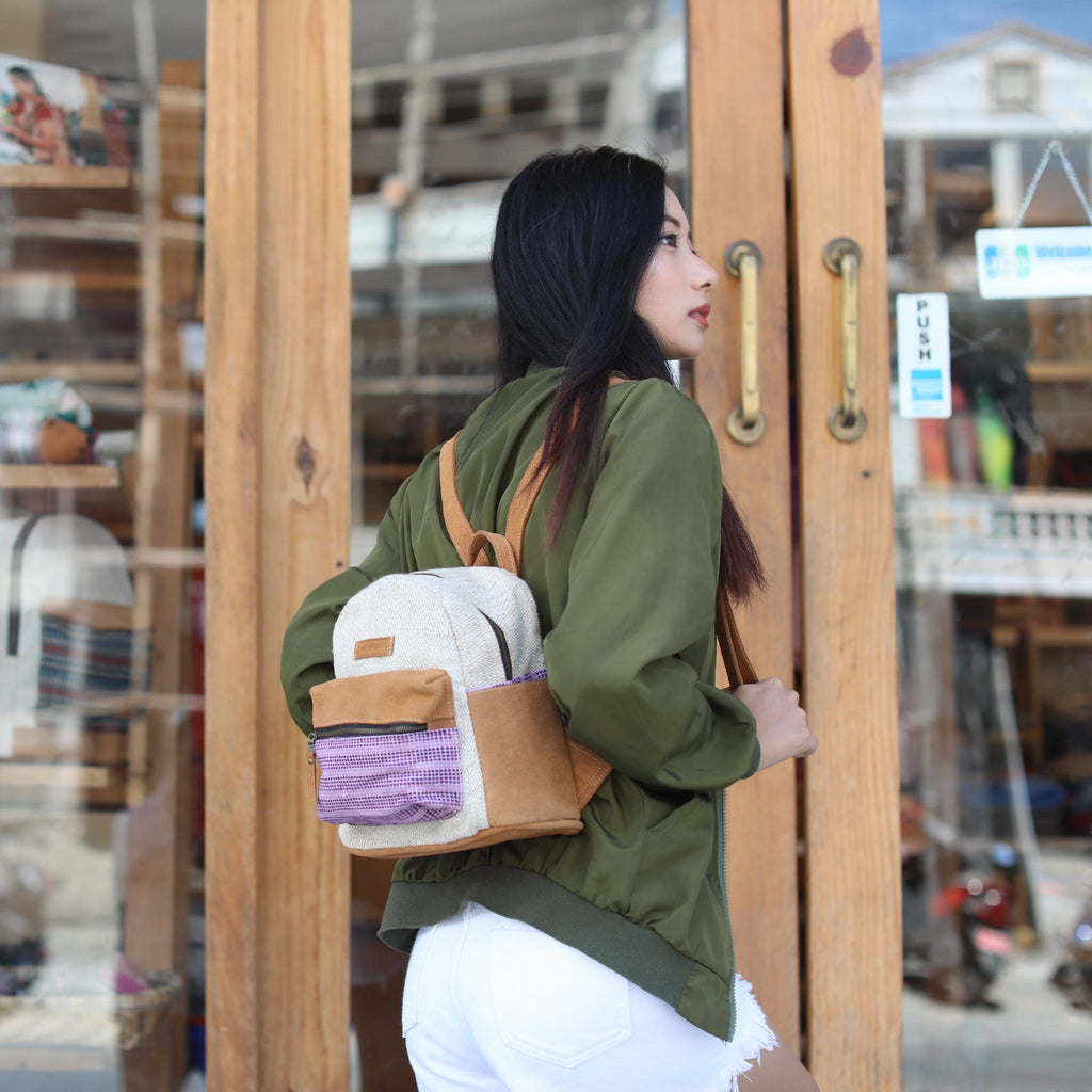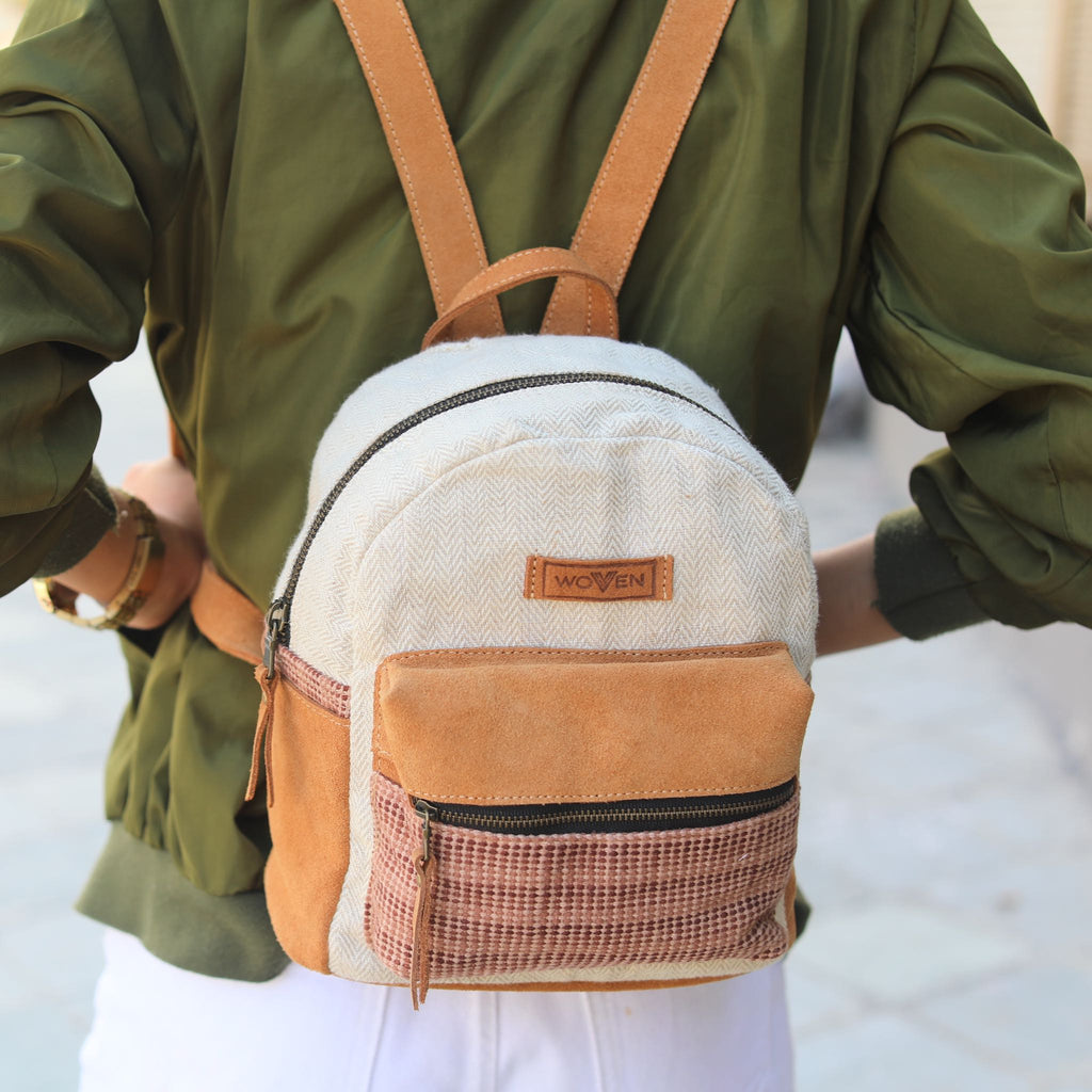 Fashionable and sporty, the mini backpack hails from the WoVen collection in Nepal. Made from hand-loomed cotton material, the bag features an earthy tone of Allo and caramel suede leather trim.